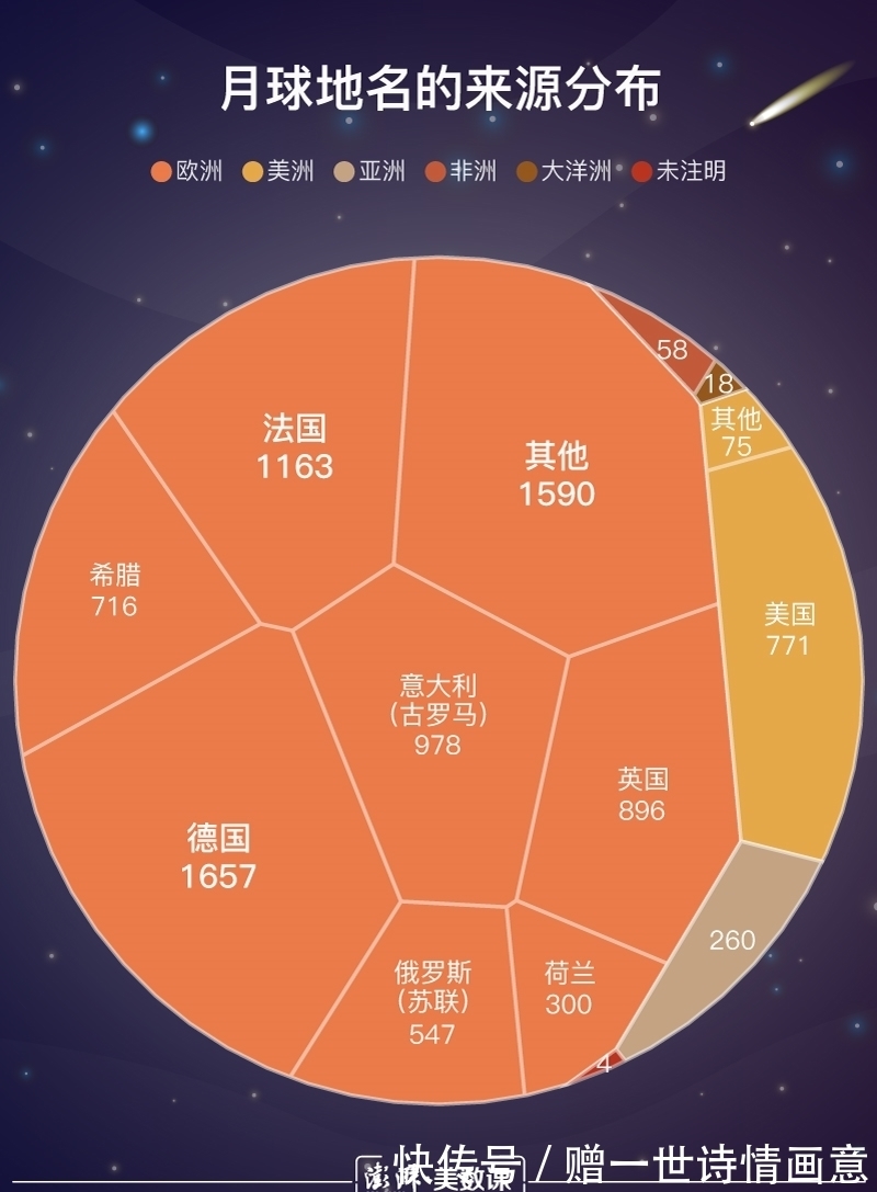 虽然拥有月球命名权的IAU是一个国际组织,但在很大程度上还是由实力决定的各个国家探索月球。决定了。在9000多个月球地理实体的命名中,属于每个国家的名称数量差异很大。其中,欧洲国家占绝大多数,其次是美洲,而亚非国家仅占少数。
