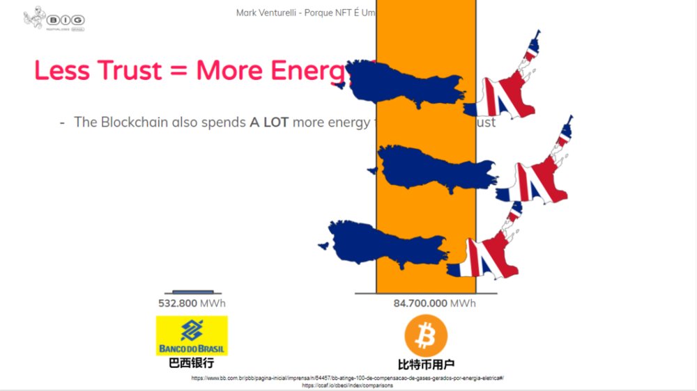 文泰利举了个例子:拥有9000客户的巴西银行,每年用电量约532.8兆瓦时;而世界范围内的1亿6000万比特币持有者,每年要浪费掉8470万兆瓦时的电力,几乎是新西兰年度用电量的三倍。由此也能顺带得出,所谓区块链经济“环保”一类的说辞完全不可信。